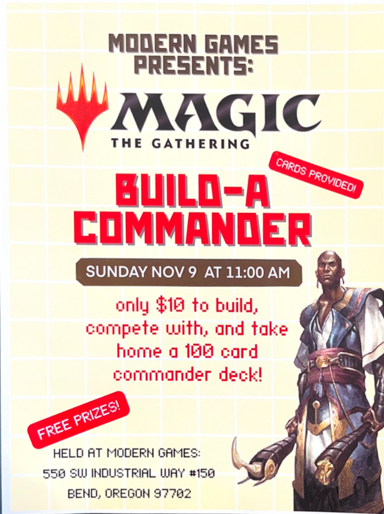 Join us November 9th at Modern Games for a community hosted Build-A-Commander event! Participating players will pay $10 to build, compete with, and take home a 100 card commander deck...and fight it out for prizes!